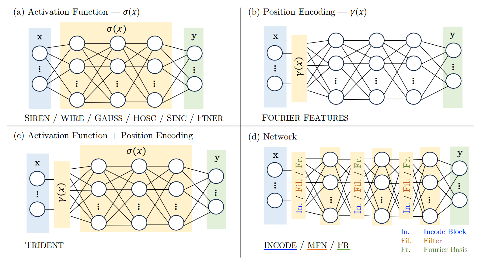 We will limit ourselves to a more classical set of architectures for our INRs. Specifically, we will only deal with a position encoding step followed by an MLP which we allow for some freedom over. In the language of the INR survey mentioned earlier, this means that we modify the yellow parts of (c) in the figure below.