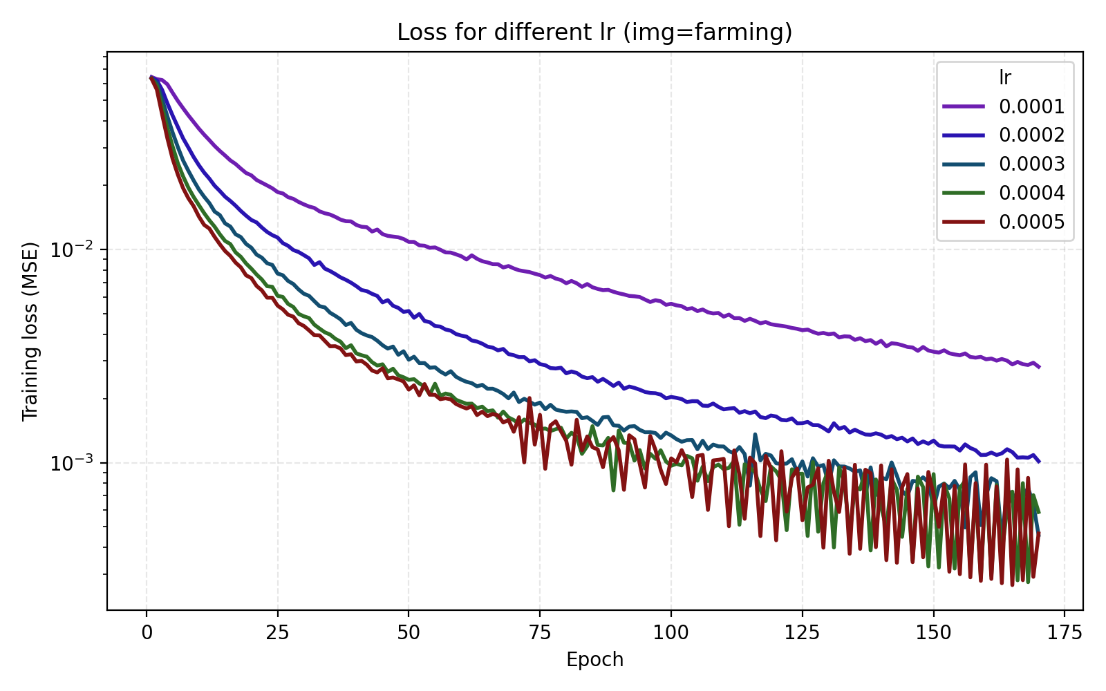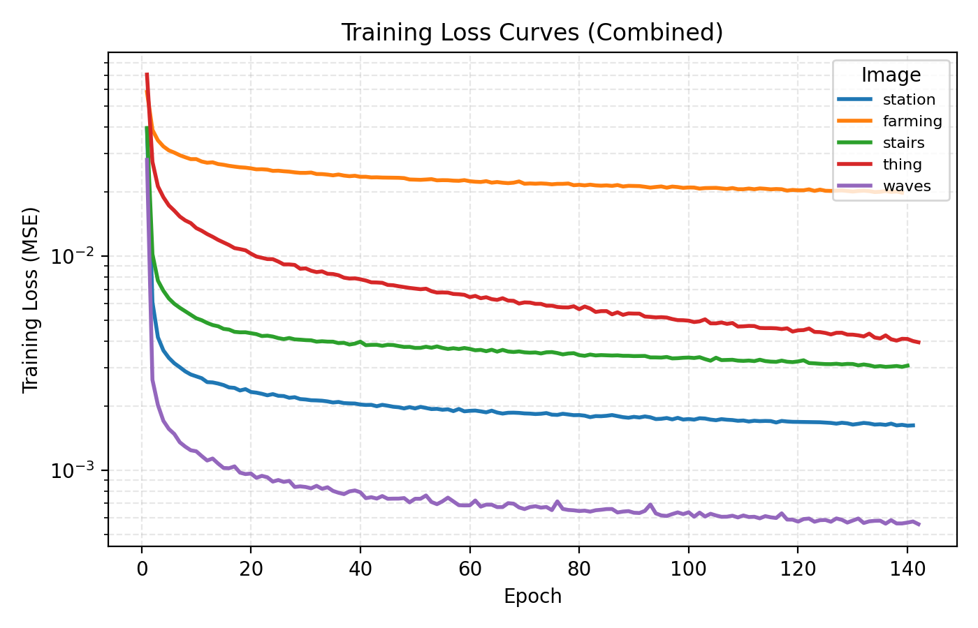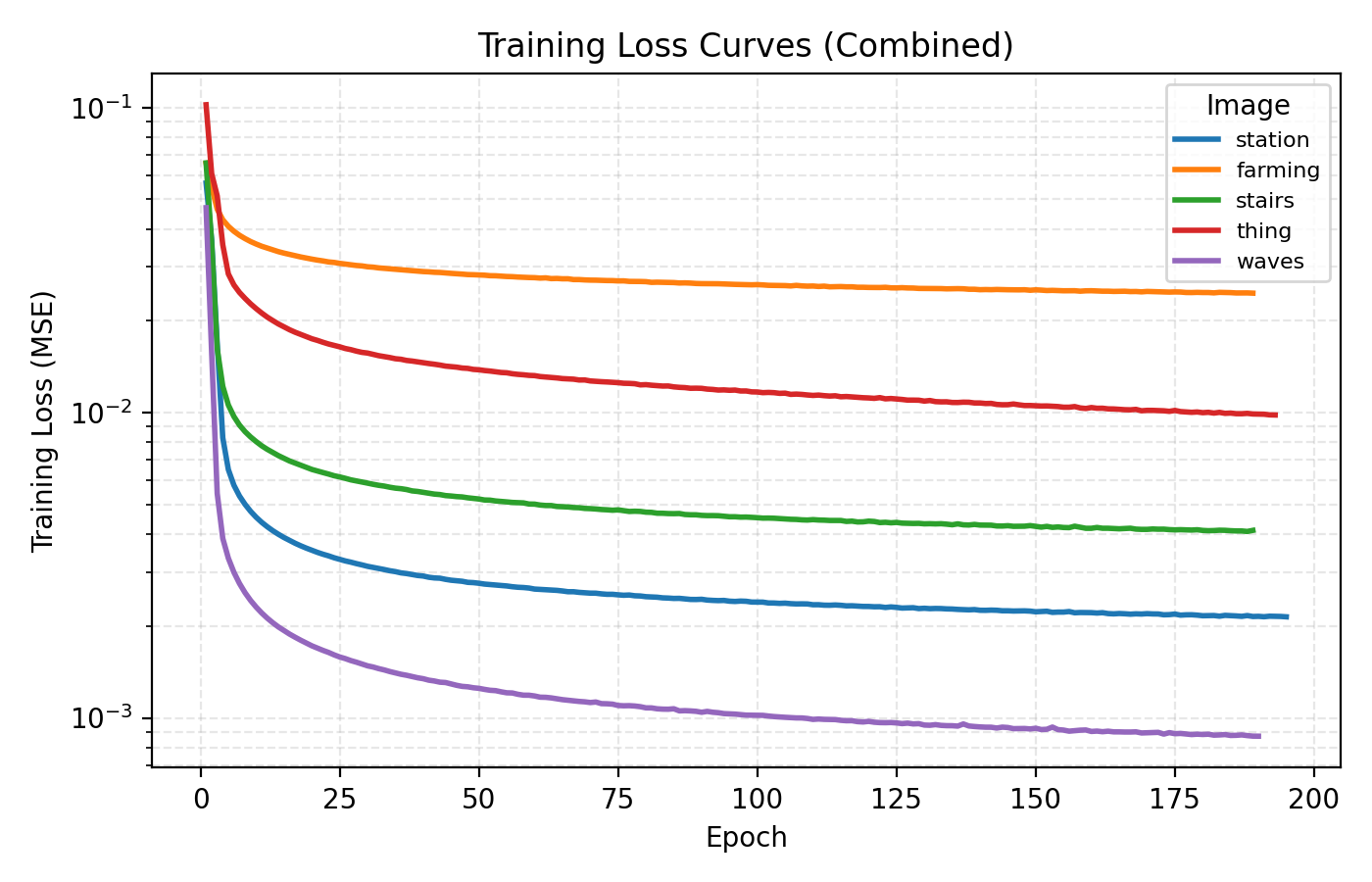 In this example the loss is extremely rapidly decreasing in the start and plateaus at rather high level. However the level at which the loss curves plateau differ greatly for the different images. We see for example that the farming image is hard to learn, most likely due to its significant high frequency components.