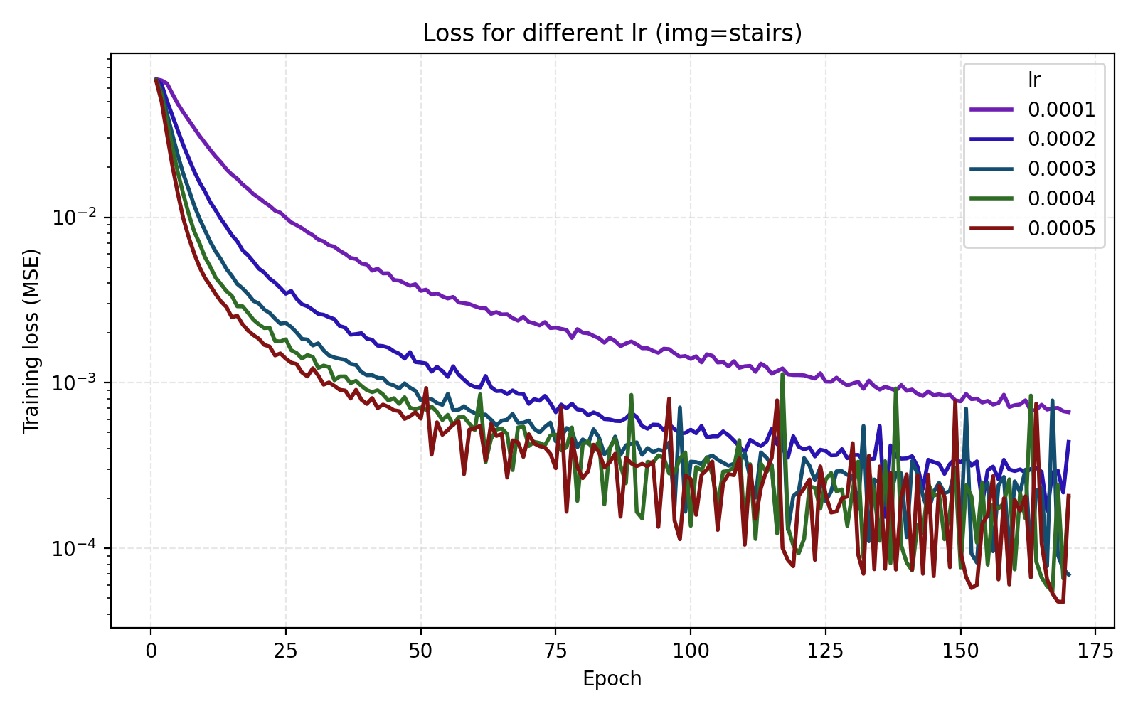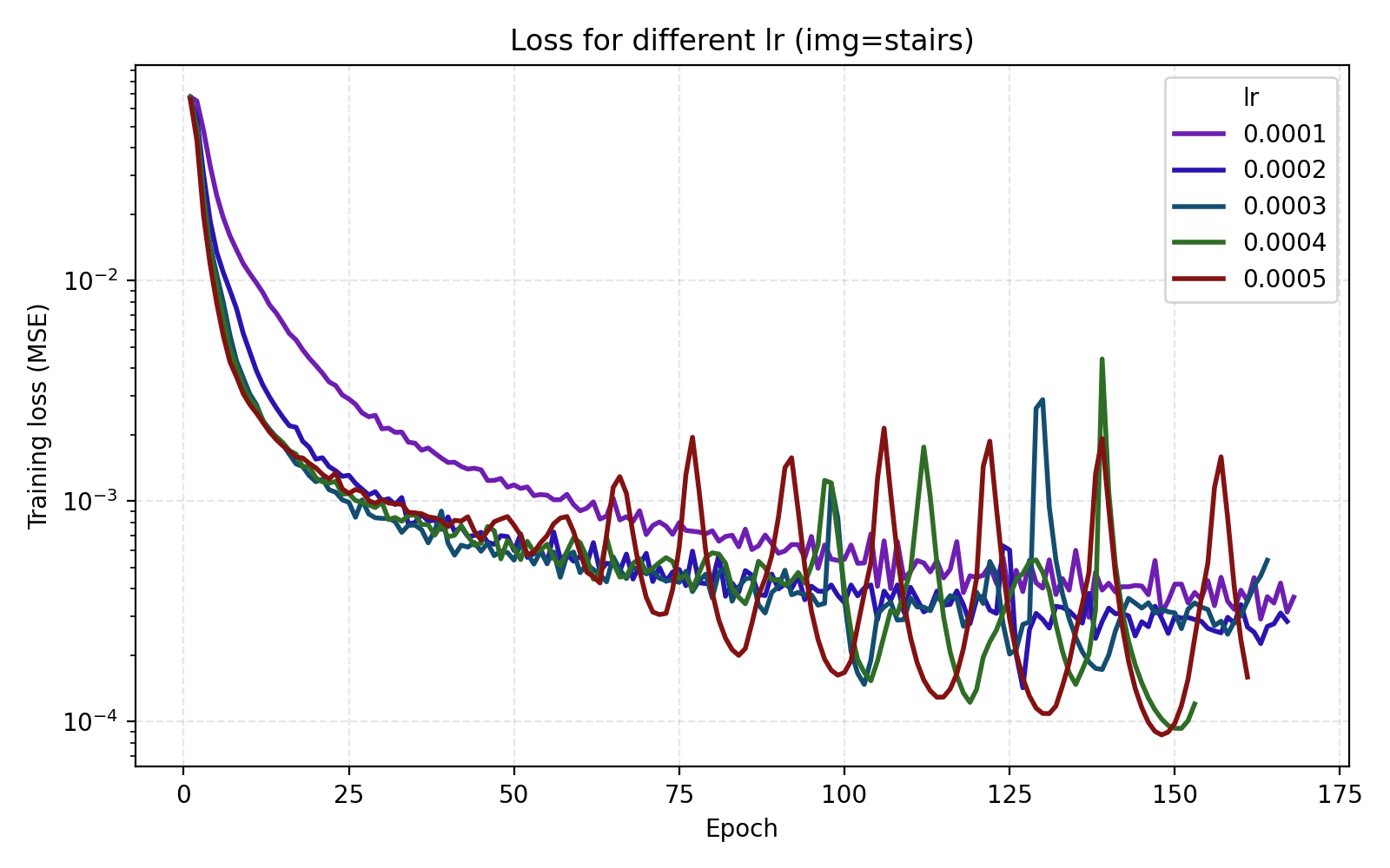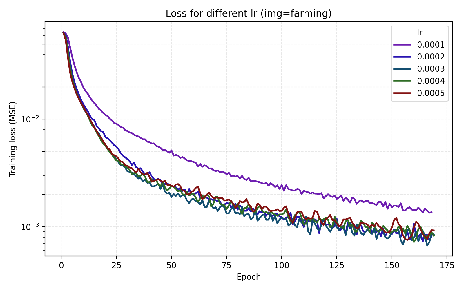 In this example the loss is extremely rapidly decreasing in the start and plateaus at rather high level. However the level at which the loss curves plateau differ greatly for the different images. We see for example that the farming image is hard to learn, most likely due to its significant high frequency components.