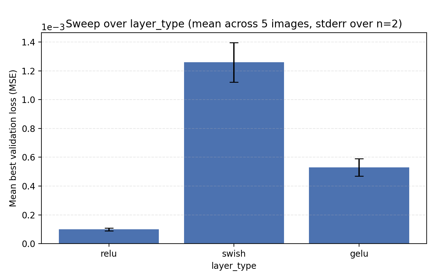 The final choice we look at is the activation function. Since we are using positional encodings, we are only comparing some standard choices, specifically ReLU, GELU and Swish. So far all our sweeping has been done with ReLU so it perhaps should not be a surprise that it performs best. Still, its margin is at least slightly remarkable.