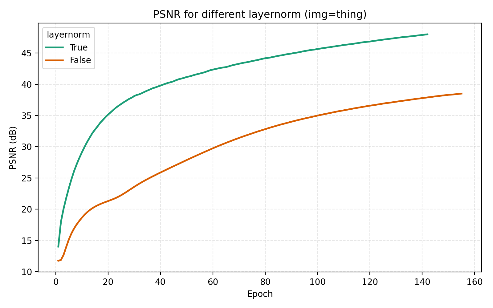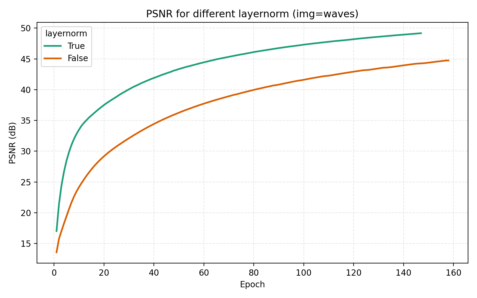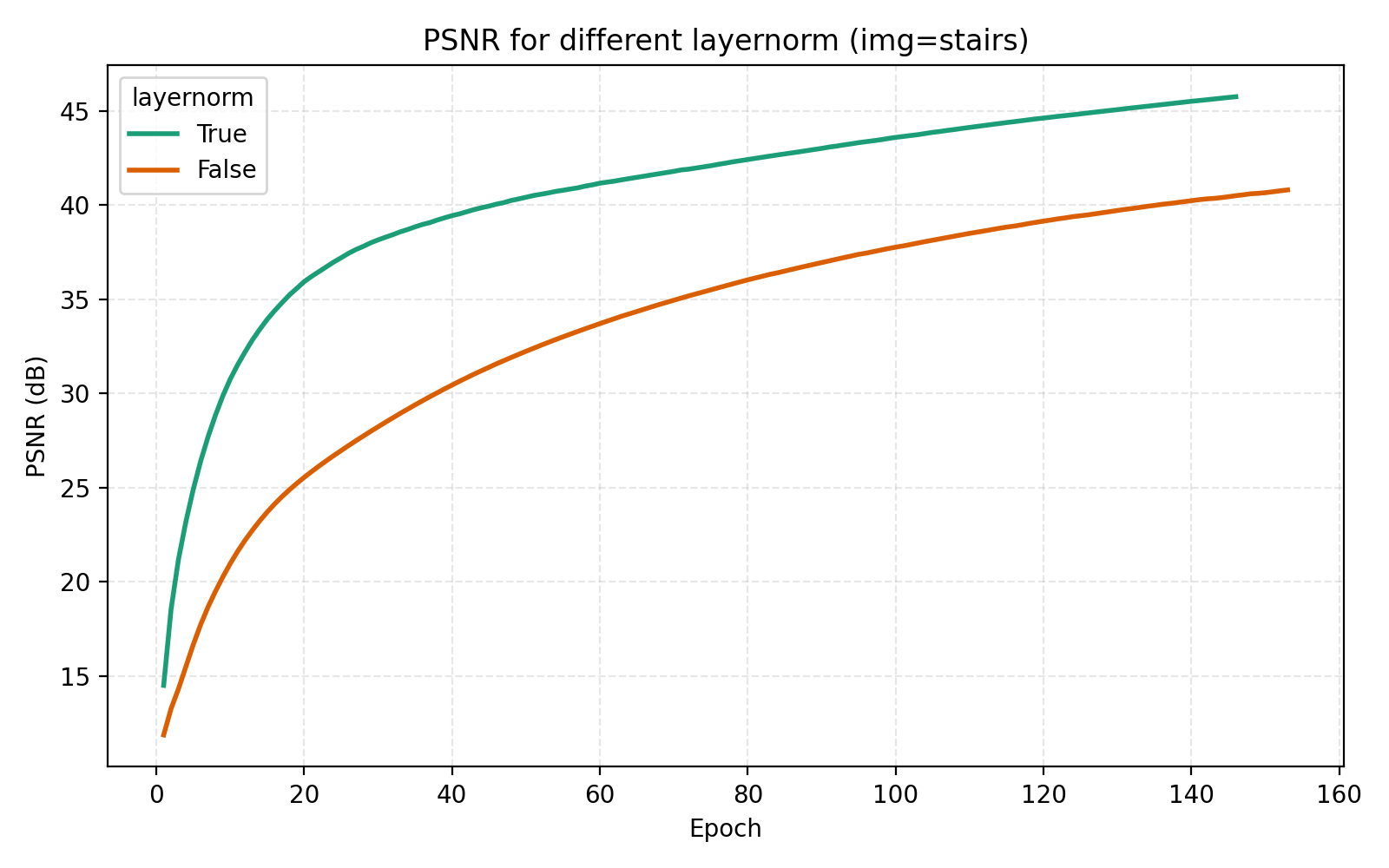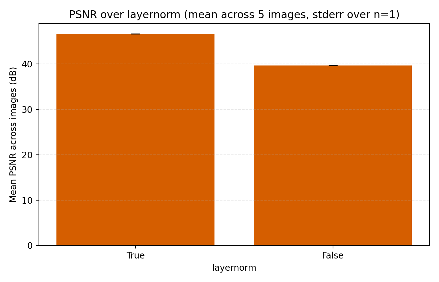 While this looks like a clear win for LayerNorm, if we look closer at the MSE for stairs (image #2) and waves (image #5), we see that MSE dips slightly lower at its best. However for PSNR the win for layernorm = True is clear and so we adopt it. Note also in the figures how much faster the network is when training with LayerNorm active. During the preparation of this post I also looked at RMSNorm and pre/post LayerNorm but found no big differences. This implementation is for post-LayerNorm.