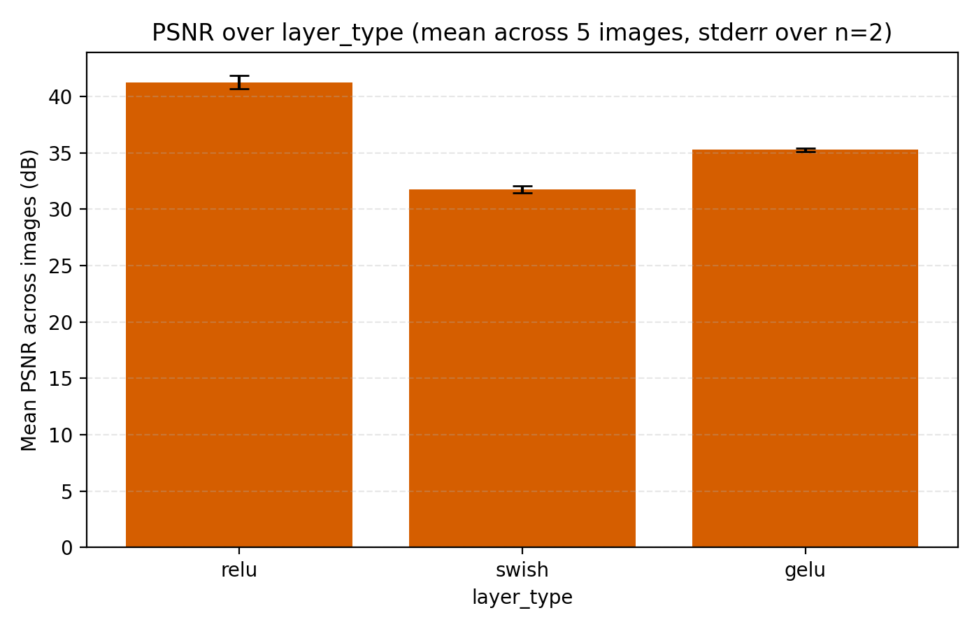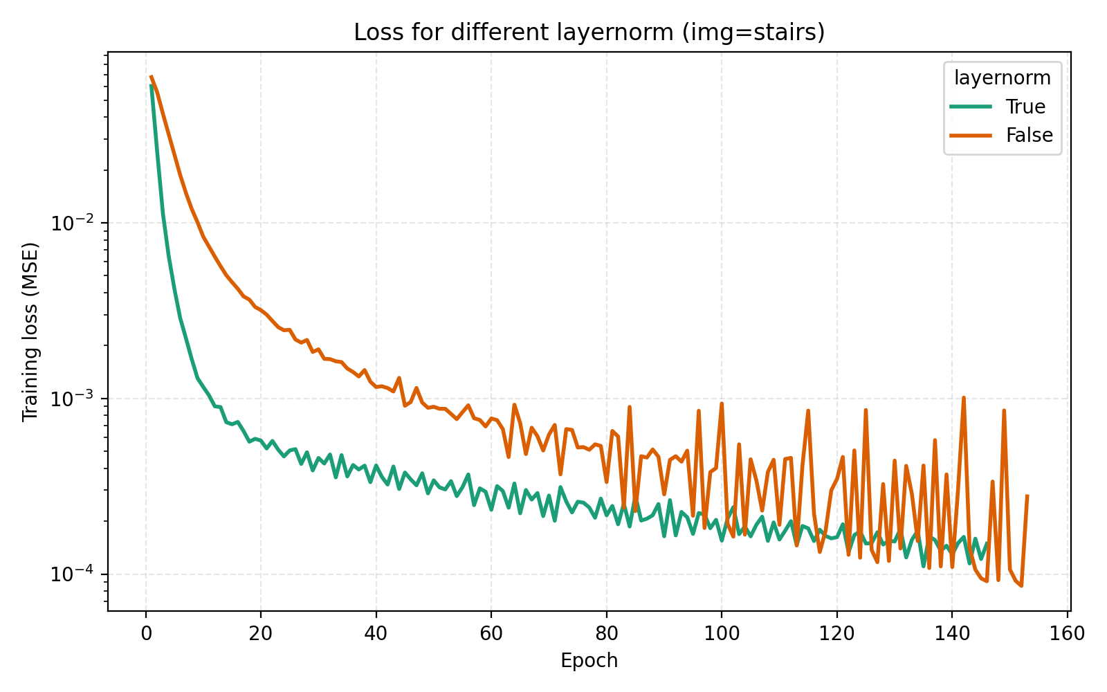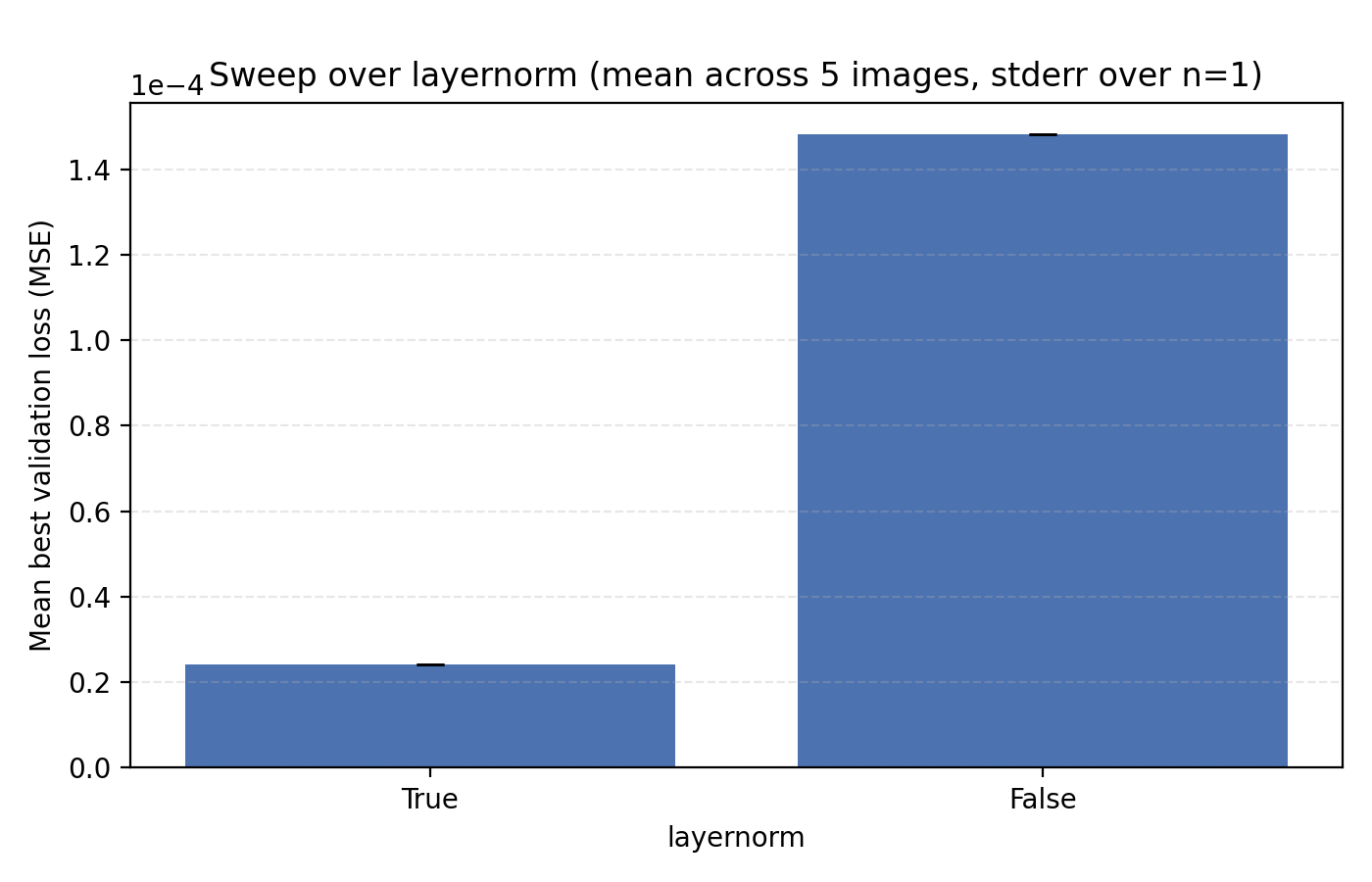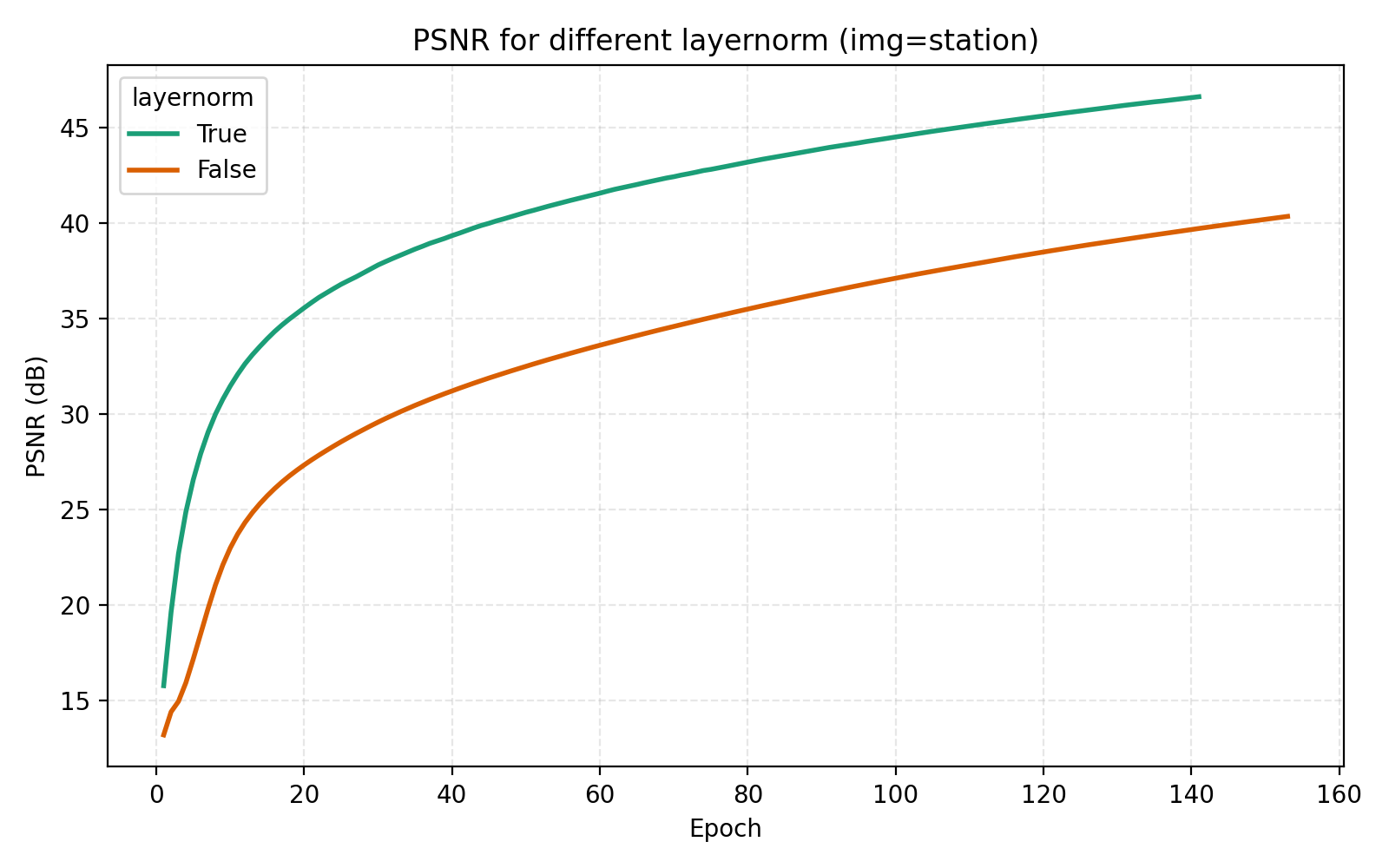 While this looks like a clear win for LayerNorm, if we look closer at the MSE for stairs (image #2) and waves (image #5), we see that MSE dips slightly lower at its best. However for PSNR the win for layernorm = True is clear and so we adopt it. Note also in the figures how much faster the network is when training with LayerNorm active. During the preparation of this post I also looked at RMSNorm and pre/post LayerNorm but found no big differences. This implementation is for post-LayerNorm.