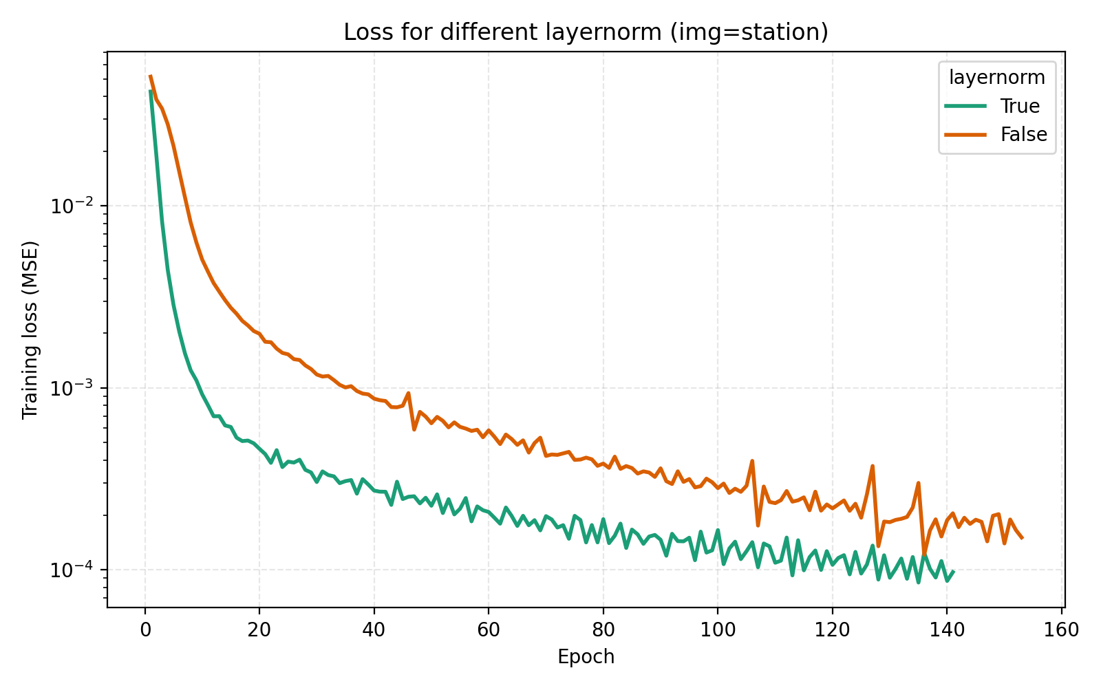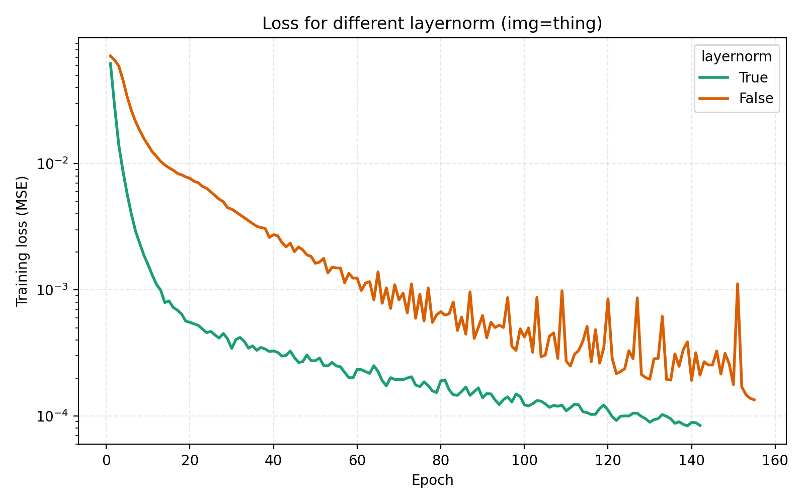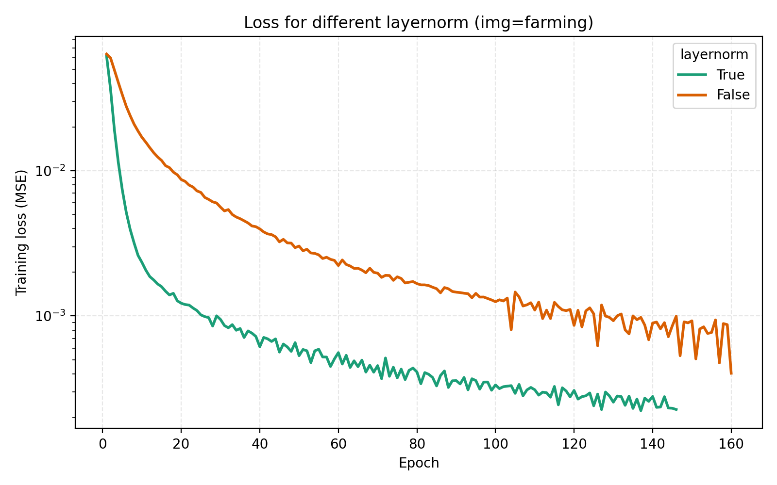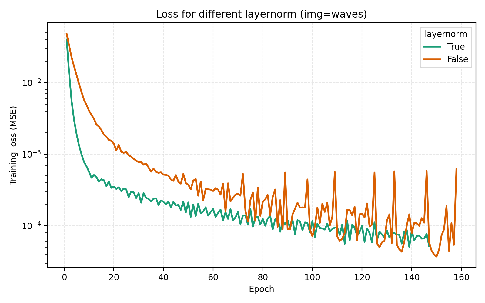 While this looks like a clear win for LayerNorm, if we look closer at the MSE for stairs (image #2) and waves (image #5), we see that MSE dips slightly lower at its best. However for PSNR the win for layernorm = True is clear and so we adopt it. Note also in the figures how much faster the network is when training with LayerNorm active. During the preparation of this post I also looked at RMSNorm and pre/post LayerNorm but found no big differences. This implementation is for post-LayerNorm.