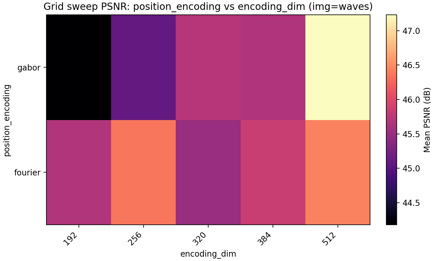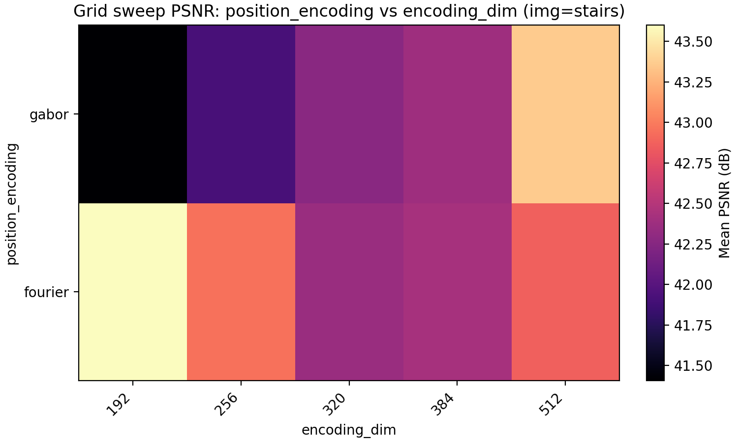 The last property we look at is Gabor feature encodings. Just as for the activation function, we have so far made the (few) decisions about the architecture to optimize for Fourier features which puts Gabor features at a disadvantage. Since for Gabor features each dimension in encoding_dim has less energy since it is localized in position, we explore higher dimensional encoding dimensions at the same time.