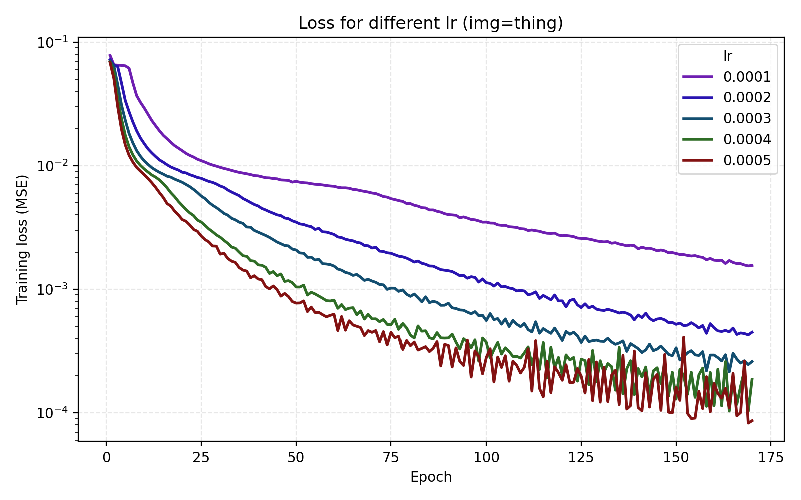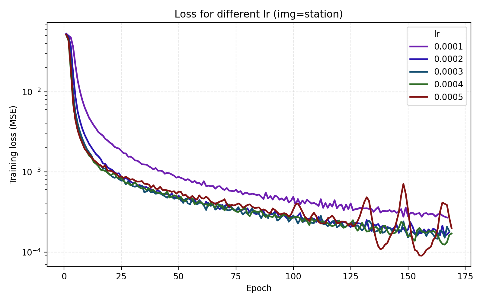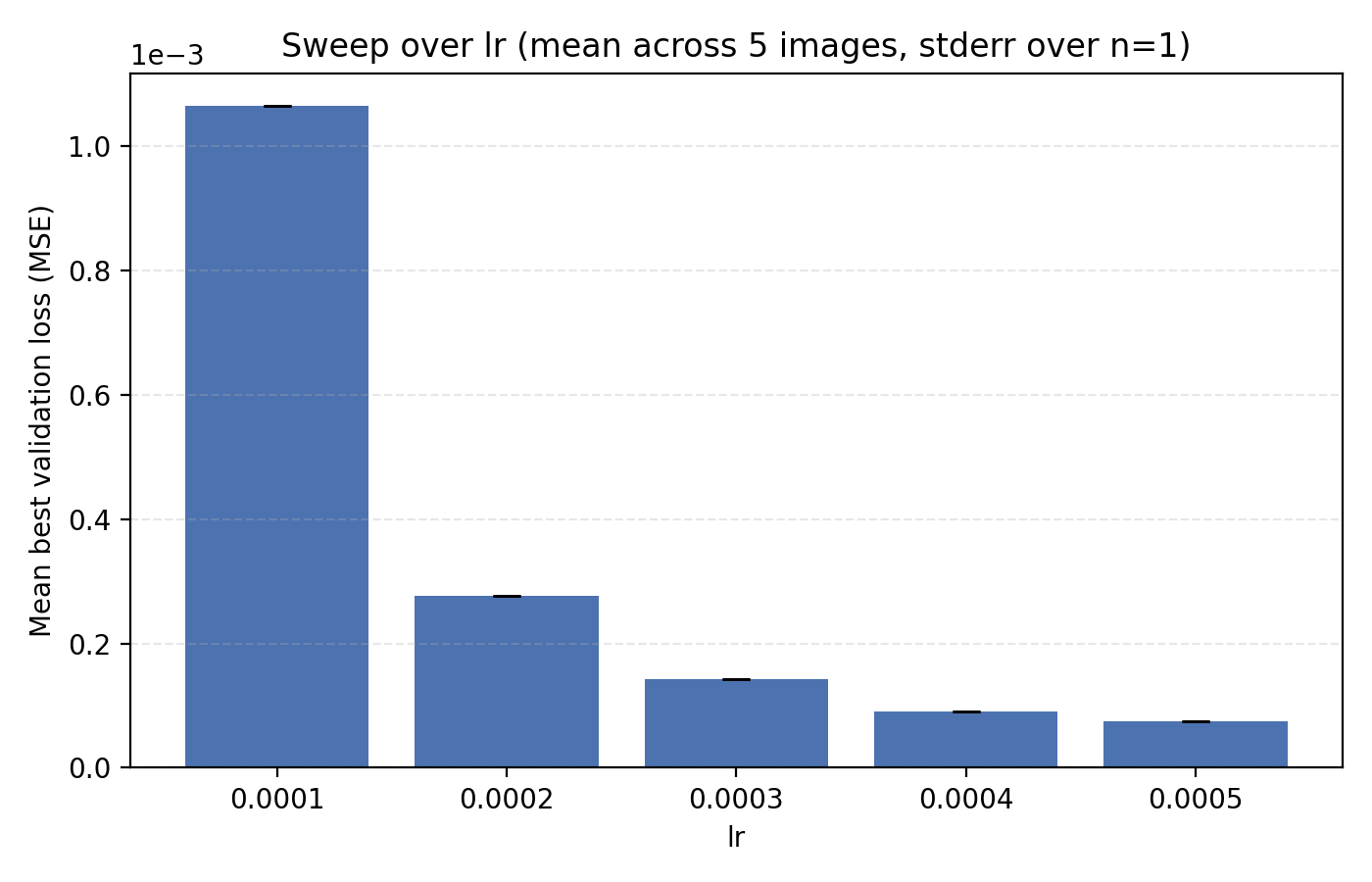 It is now easier to compare the five learning rates and we find that 5e-4 is optimal in this case.