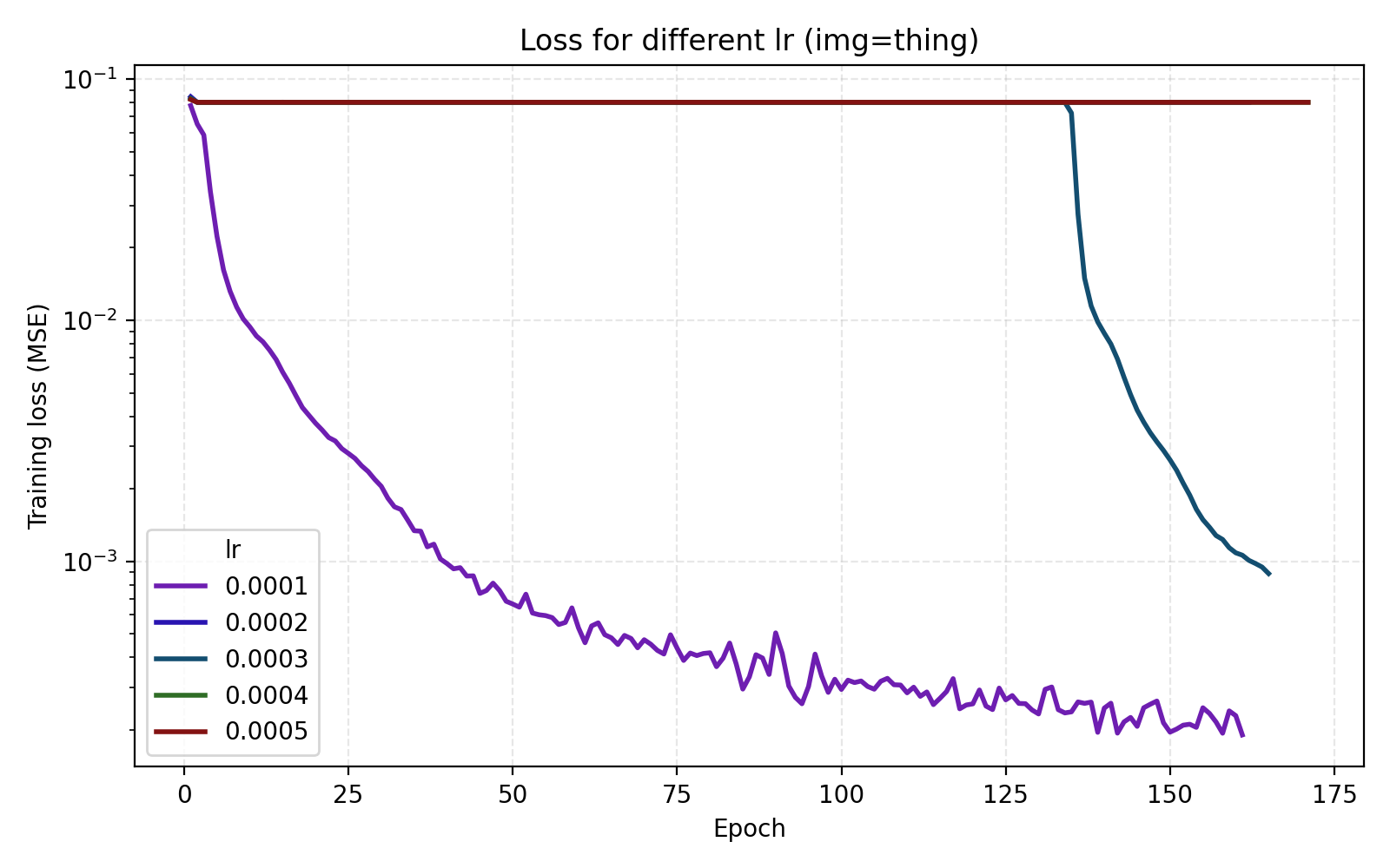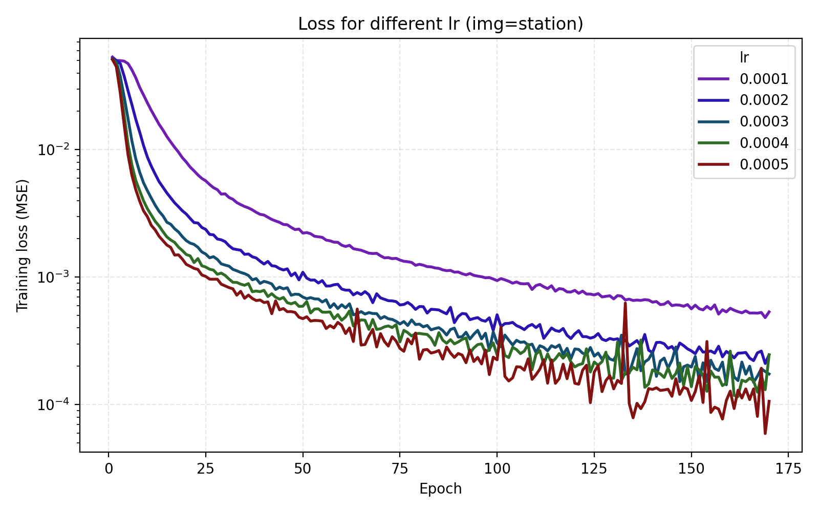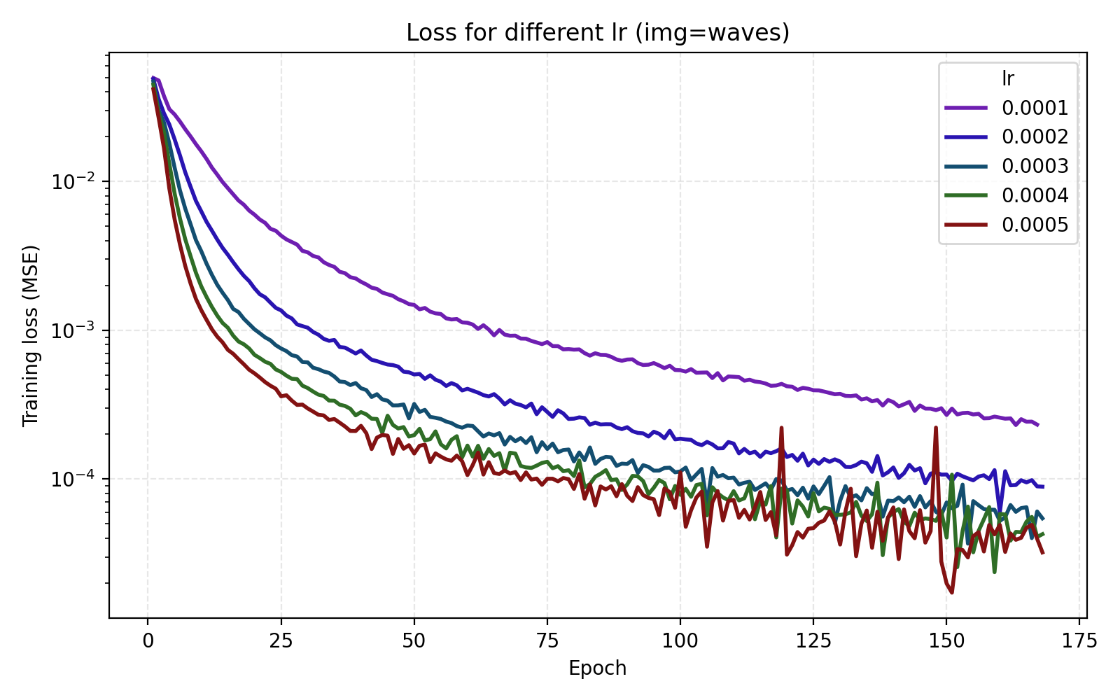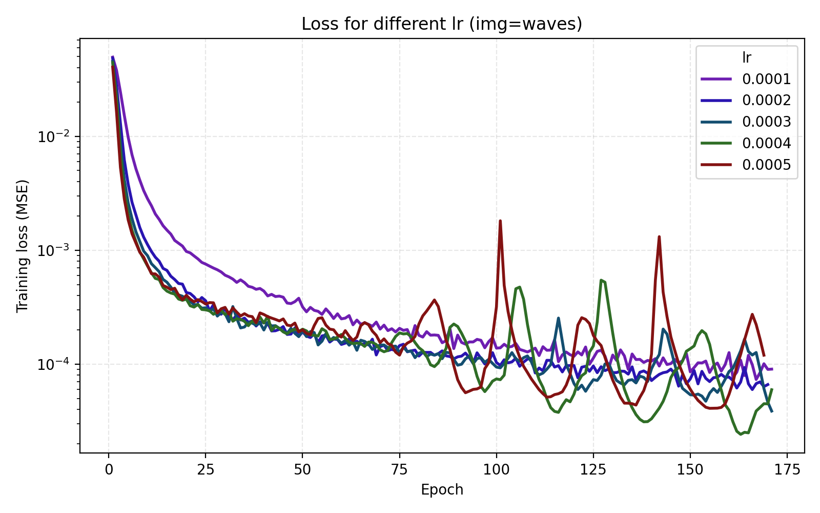 It is now easier to compare the five learning rates and we find that 5e-4 is optimal in this case.