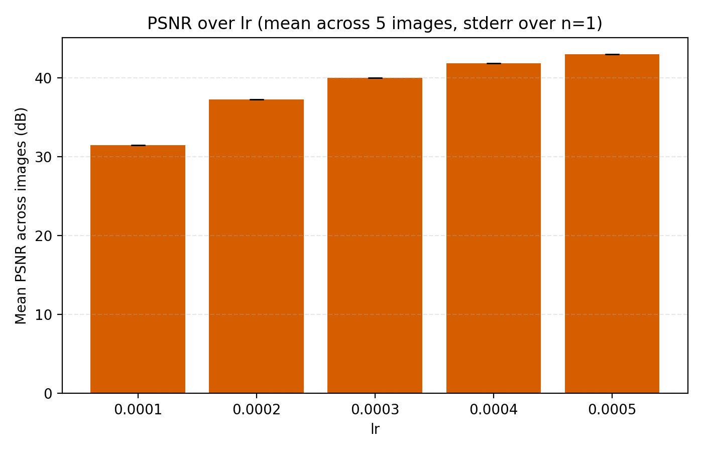 Here we get a large jump in average PSNR from 26 dB to 35 dB. Setting encoding_dim = 256 and freq_scale = 80 bumps the parameter count slightly to 4.5M. We now move to tuning the learning rate. In this case, just looking at the average MSE or PSNR does not tell the whole story since there is a large discrepancy between the images.