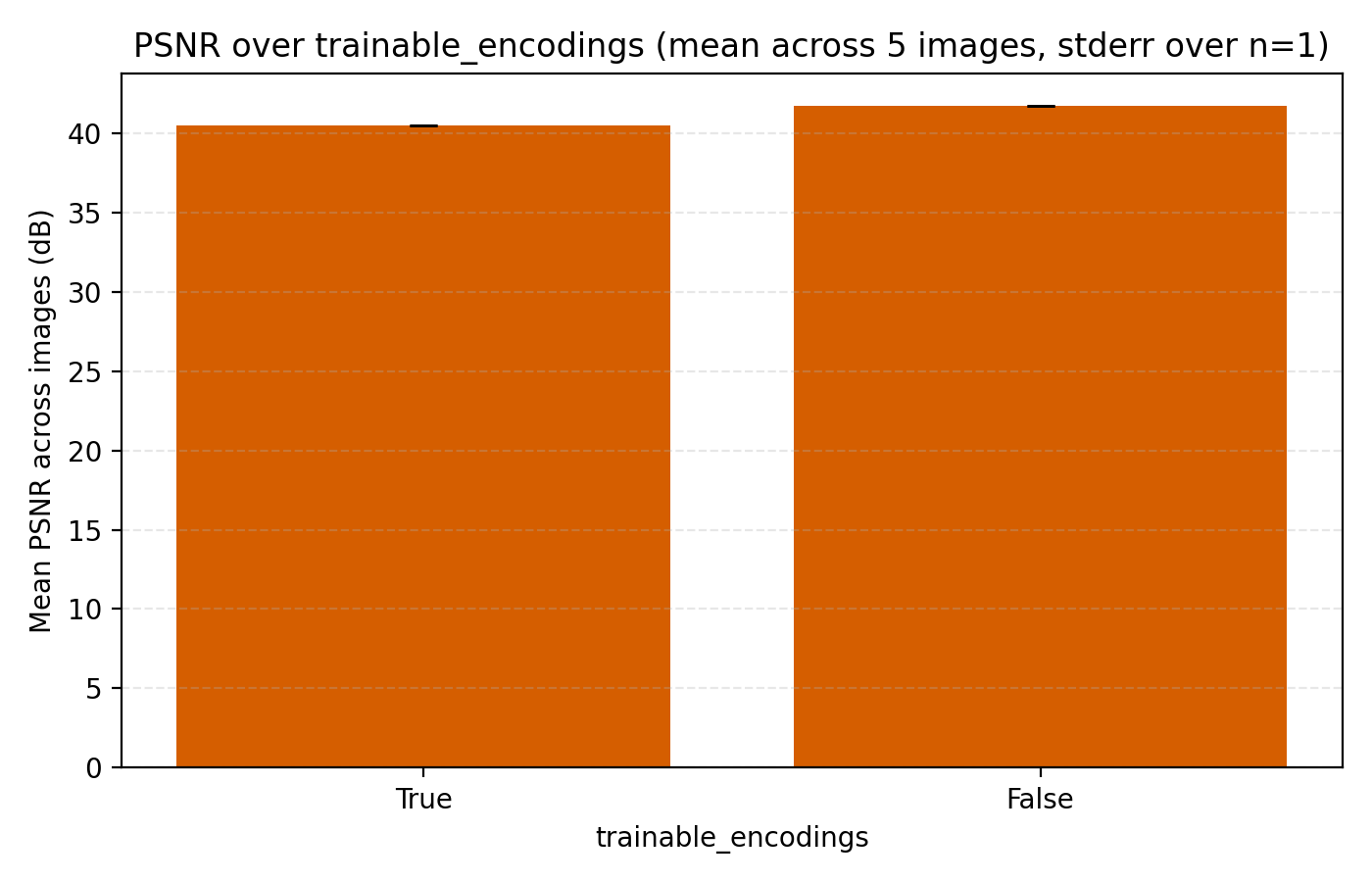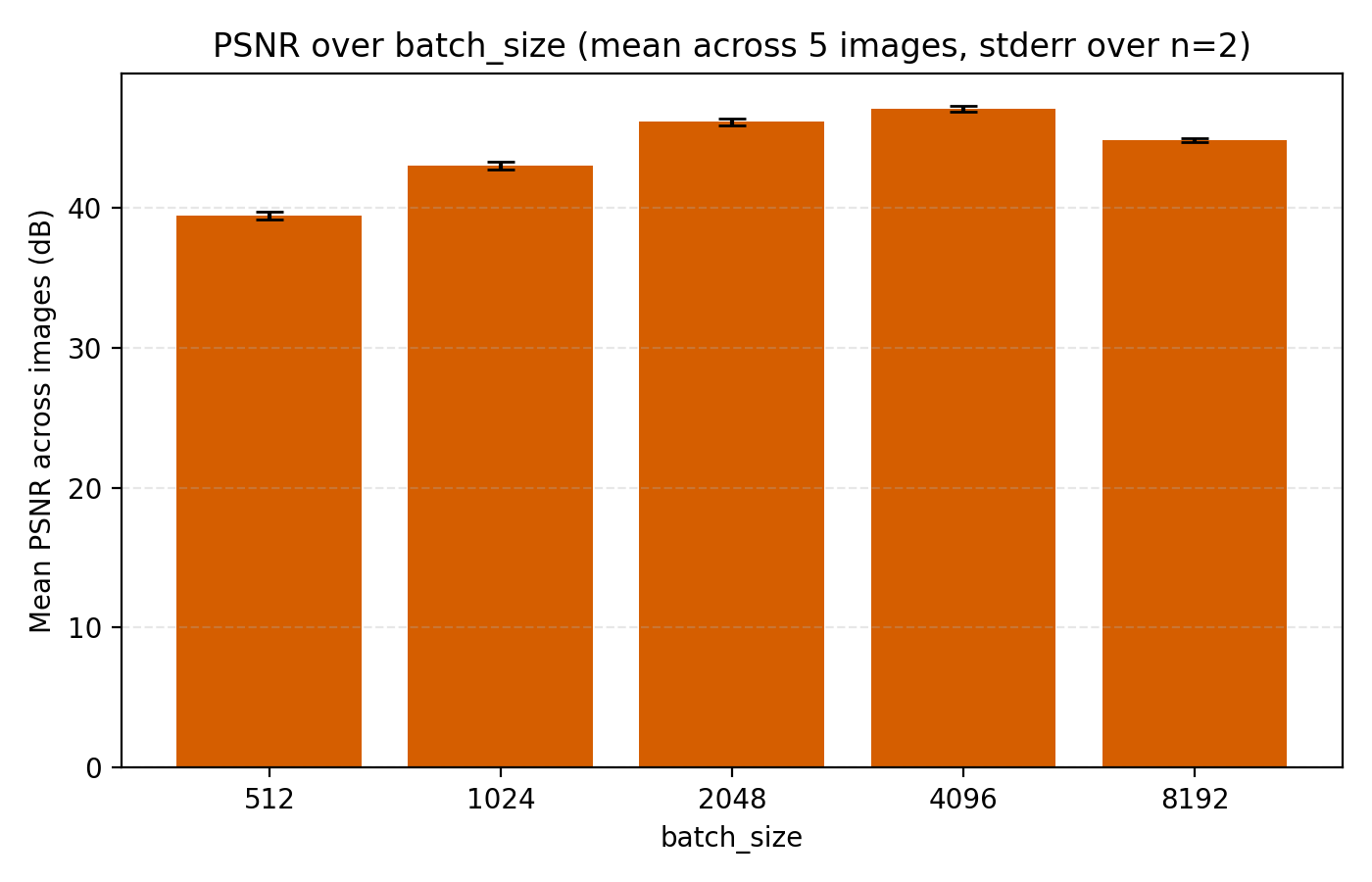 To get a comparison which has hopes of generalizing, we choose a collection of 5 images, each of resolution 768×768 pixels. Our error metric will be the standard peak signal-to-noise ratio (PSNR) since this is often used in papers when comparing models. To keep the comparison fair, we train the models for 3 minutes per image. This seems to be in line with or less than the typical training time used in papers.