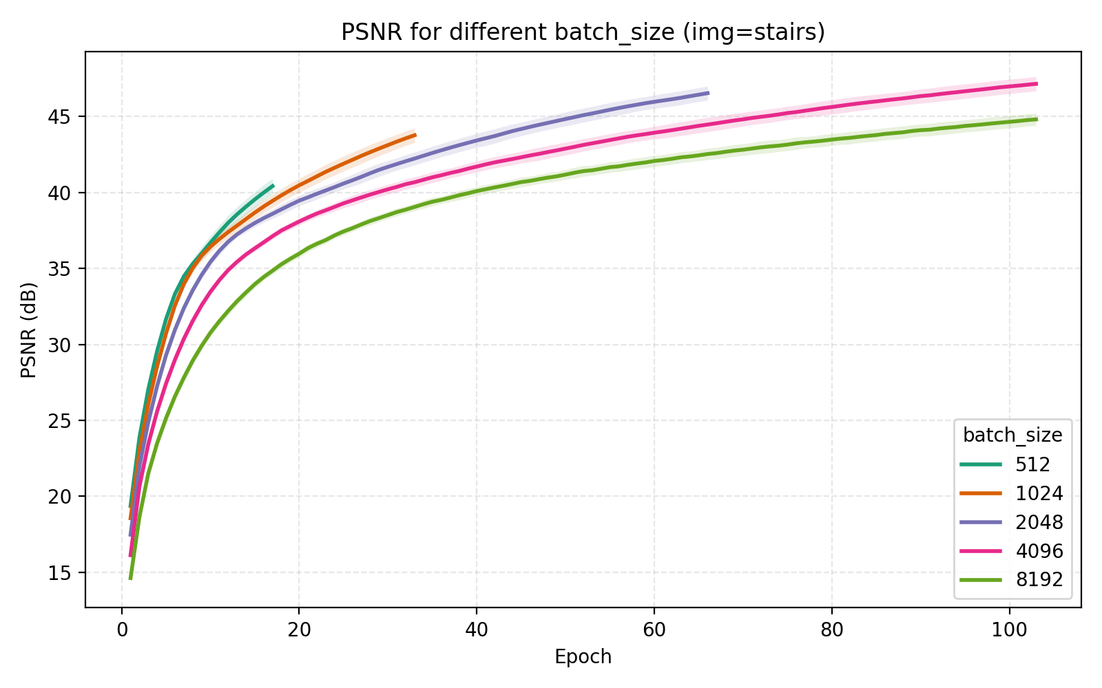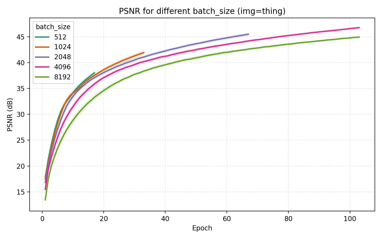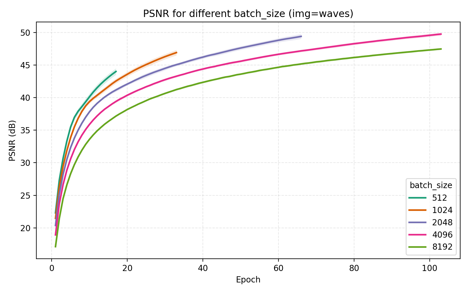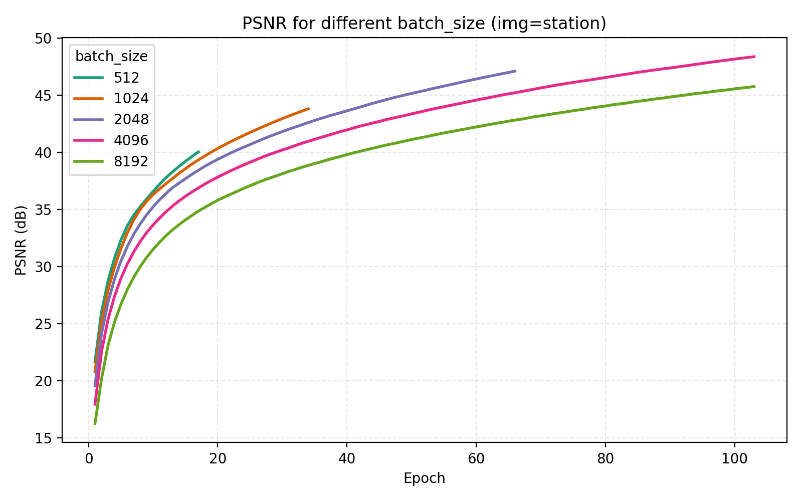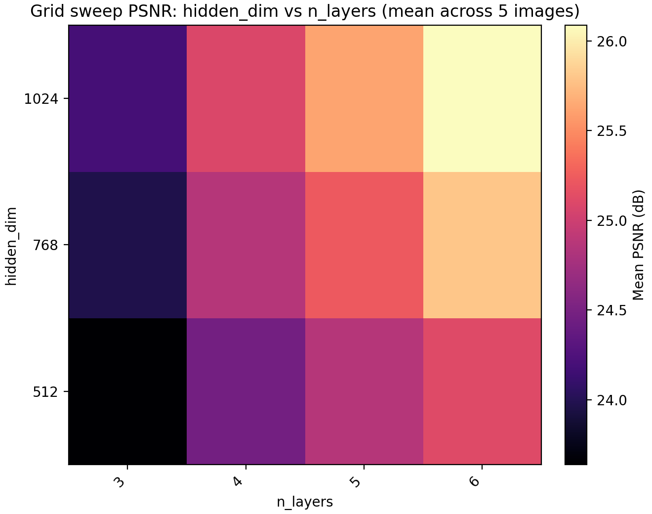 Based on this information we set n_layers = 6 and hidden_dim = 1024 but leave a note about trying out larger values for these later. The model now has 4.3M parameters but we remark that we have chosen to only use training time as our restriction. Obviously this is not the correct restriction if one is attempting to, e.g., compress images using an INR, in which case we would probably have a fixed parameter budget as well.