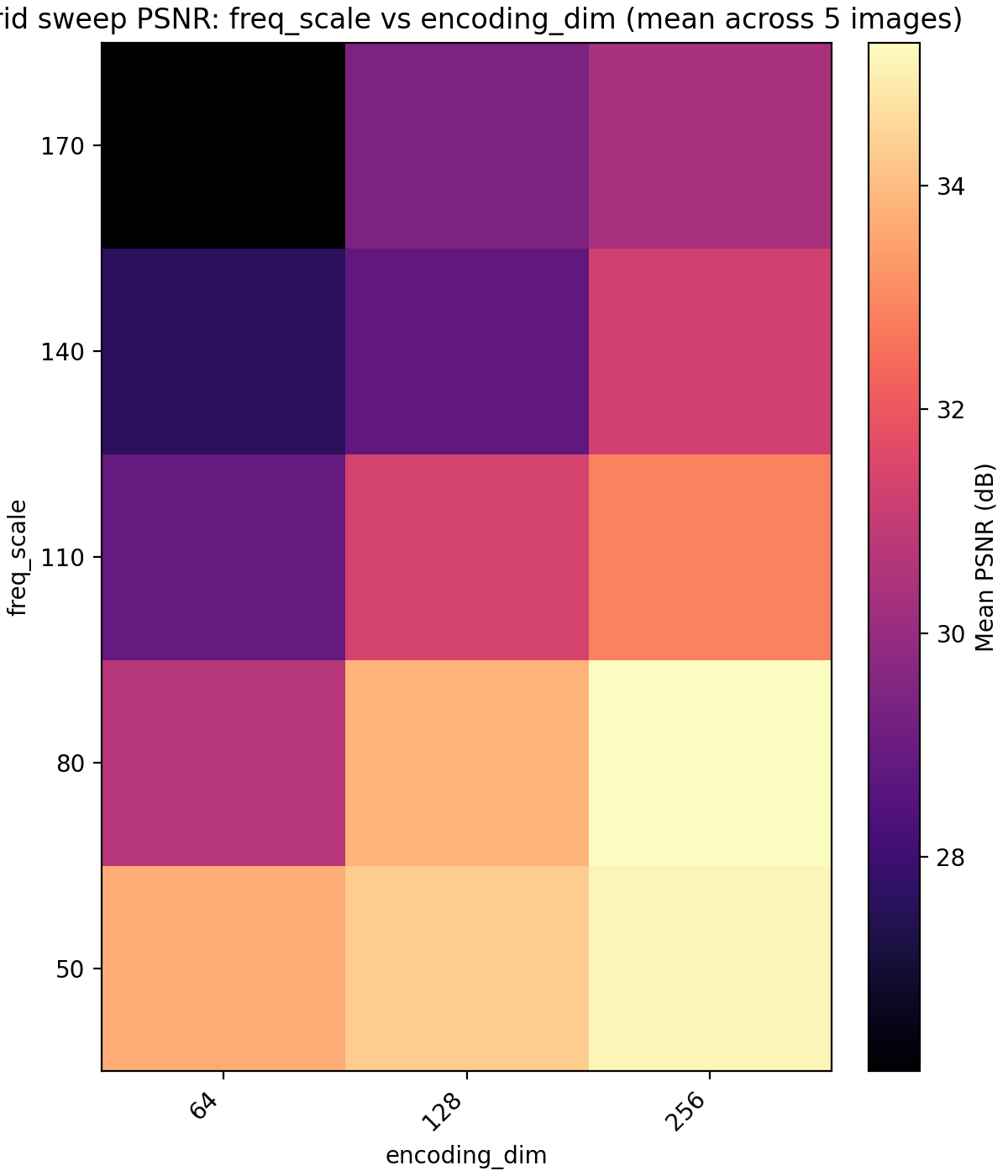 We could definitely have pushed MLP size further at this point but remark that when we have no positional encodings, we get stuck in this sort of plateau where we can get performance gains from increasing the parameter count but we are fundamentally unable to express the details of the image with it and are only digging deeper into a local minimum. For this reason we next up look at encoding dimension and frequency scale. Recall that the encoding dimension is the output dimension of $\gamma$ and the frequency scale is the standard deviation of the Gaussian which the frequencies are taken from.