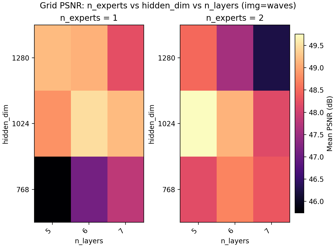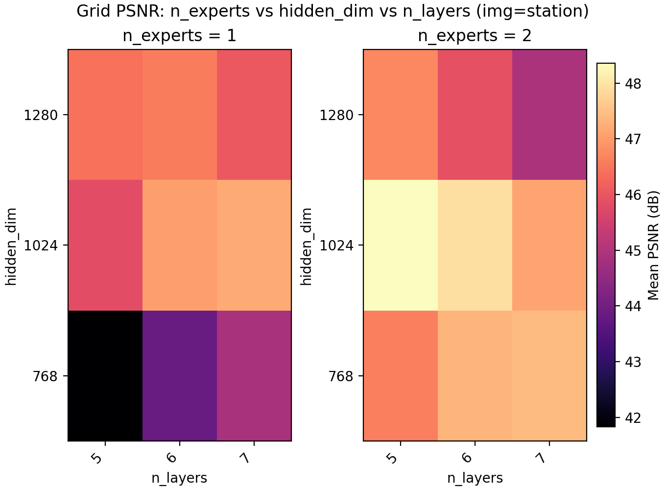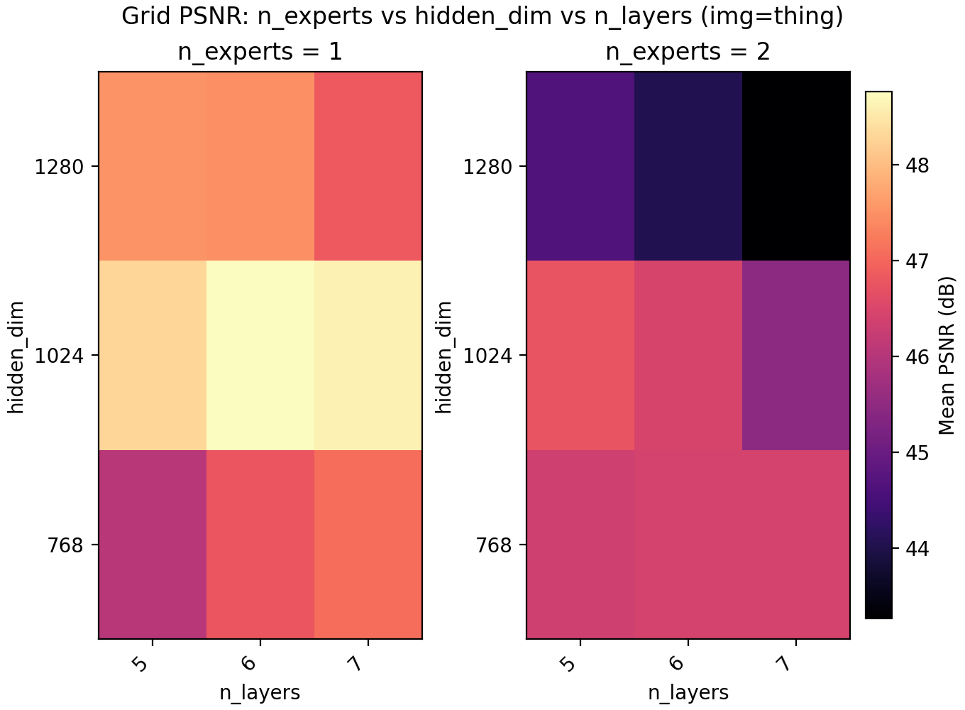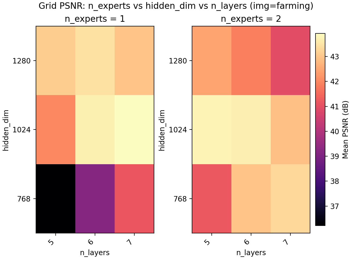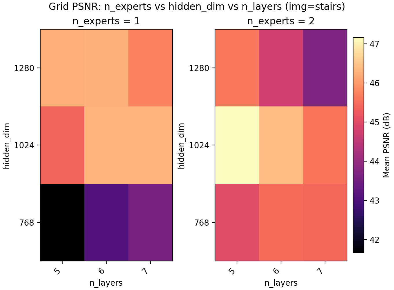 For the results we find a very slight edge for n_experts = 2 but at two training runs per configuration and image, the result is not statistically significant. Still, we keep it and lower n_layers to 5 to get a model with 6.8M parameters with a PSNR of 47.15.