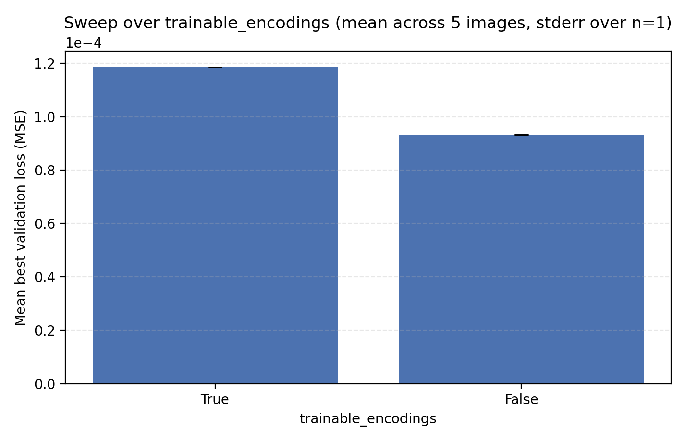 Gabor features have the additional effective hyperparameter deciding how to choose the widths of the Gabor atoms. In the code, we have set this to $0.1 \sqrt{\frac{d_{enc}}{256}}$ where $d_{enc}$ is the per-dimension encoding dimension so half of our actual encoding dimension in the 2D case. This choice was made to avoid an additional hyperparameter but would obviously benefit from tuning. Still, we stick with Gabor features for now.